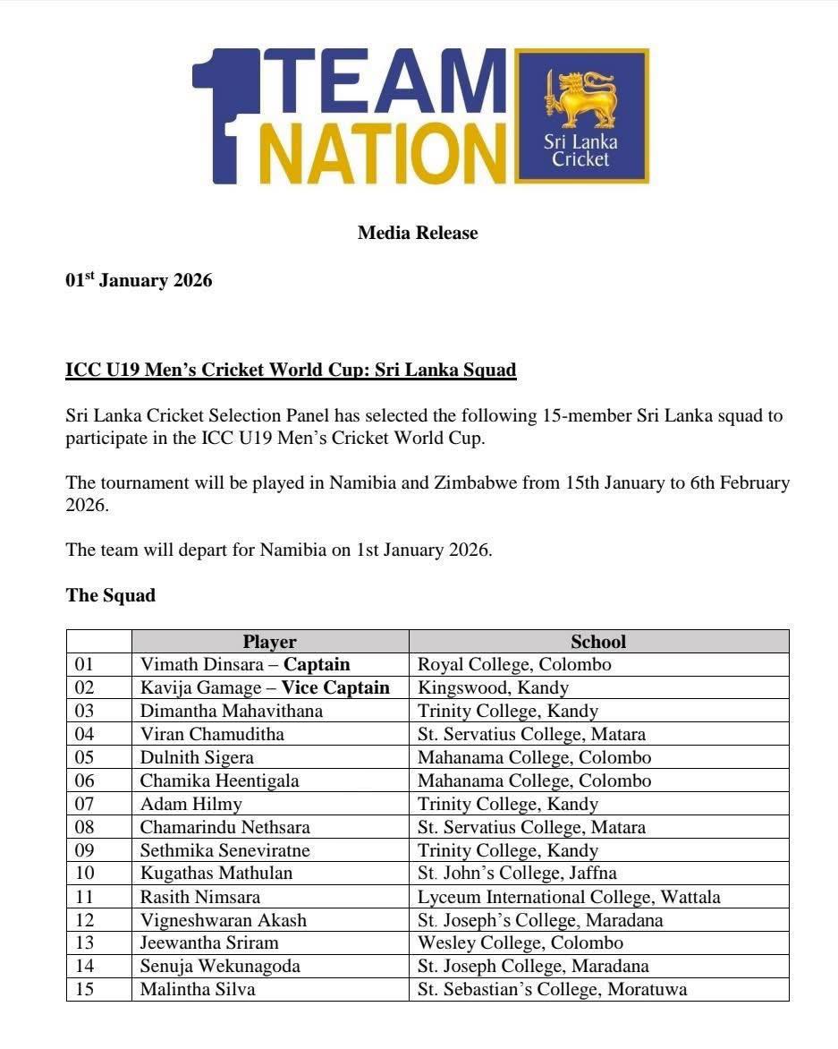 ஸ்ரீ லங்கா கிரிக்கெட் தெரிவுக்குழுவினால் 19 வயதிற்குட்பட்ட ஆடவர் கிரிக்கெட் உலக கிண்ணத்தில் பங்கேற்கும் 15 பேர் கொண்ட இலங்கை இளையோர் கிரிக்கெட் அணி அறிவிக்கப்பட்டுள்ளது.