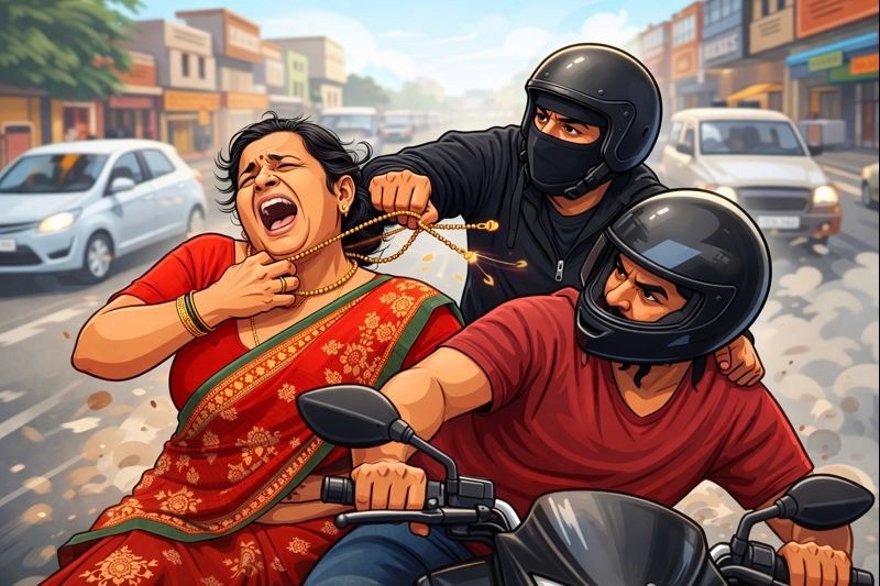 யாழ்ப்பாணம் - அரியாலை பகுதியில் வீதியில் சென்ற பெண்ணை பின்தொடர்ந்து மோட்டார் சைக்கிளில் வந்த இரு இளைஞர்கள் பெண்ணின் தங்க சங்கிலியை அறுத்துக்கொண்டு தப்பியோடினர்.