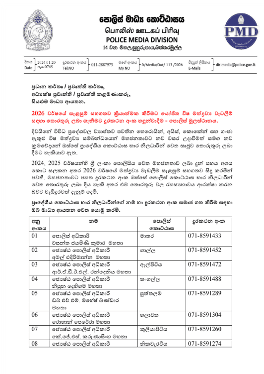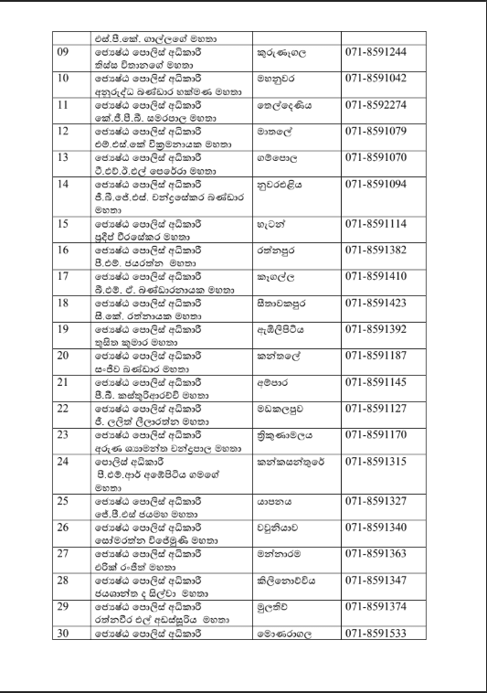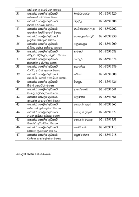 அதற்கமையஇ கீழே உள்ள தொலைபேசி இலக்கங்கள் ஊடாக பொலிஸ் பிரிவுகளுக்குப் பொறுப்பான அதிகாரிகளுக்குத் தகவல்களை வழங்க முடியும்.