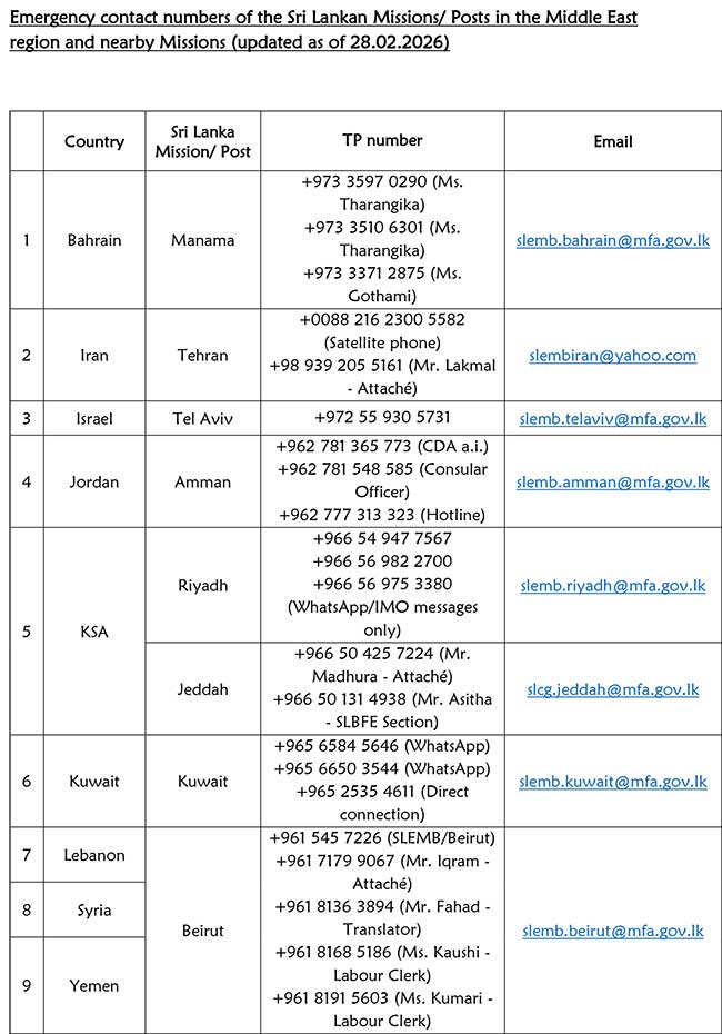 அதற்கமைய, மத்திய கிழக்கில் வசிக்கும் இலங்கையர்கள் பின்வரும் தொலைபேசி இலக்கங்களைப் பயன்படுத்தி தகவல்களைப் பெற்றுக்கொள்ள முடியும்: