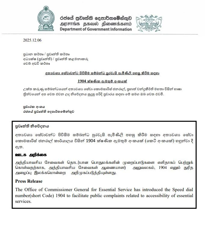 அதற்கமைய அத்தியாவசிய சேவைகள் ஆணையாளர் அலுவலகத்திற்கு 1904 எனும் அவசர இலக்கத்தின் ஊடாக அத்தியாவசிய சேவைகள் தொடர்பான முறைப்பாடுகளை முன்வைக்க முடியும் என அறிவிக்கப்பட்டுள்ளது.