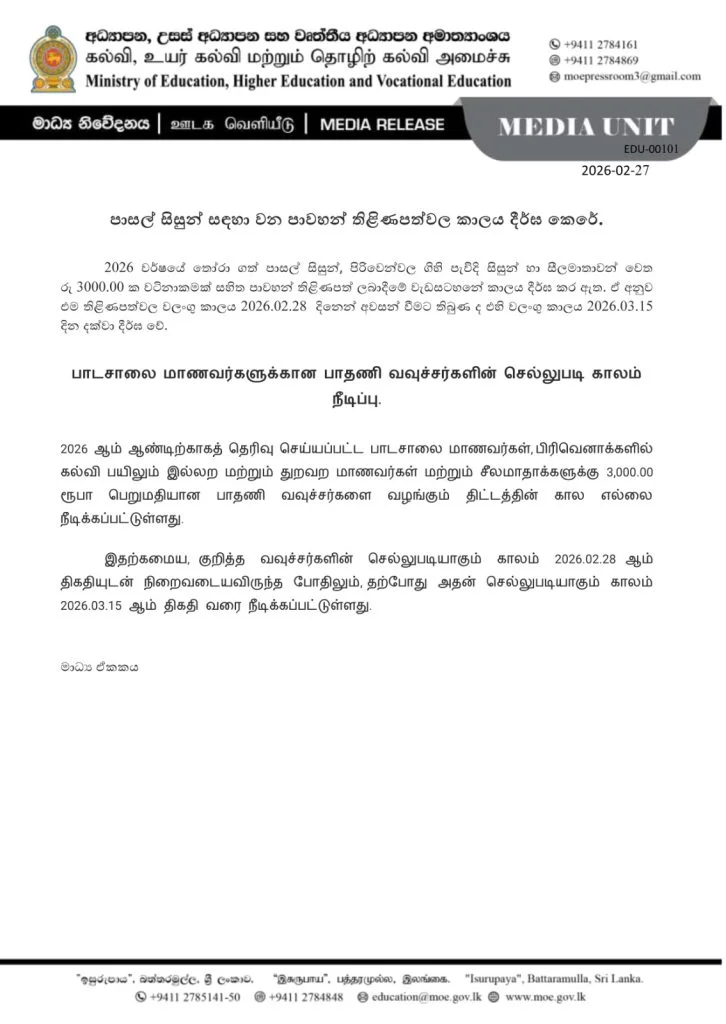 2026ஆம் ஆண்டிற்காகத் தெரிவு செய்யப்பட்ட பாடசாலை மாணவர்கள், பிரிவெனாக்களில் கல்வி பயிலும் இல்லற மற்றும் துறவற மாணவர்கள் மற்றும் சீலமாதாக்களுக்கு 3,000.00 ரூபாய் பெறுமதியான காலணி வவுச்சர்களை வழங்கும் திட்டத்தின் கால எல்லை நீடிக்கப்பட்டுள்ளது.