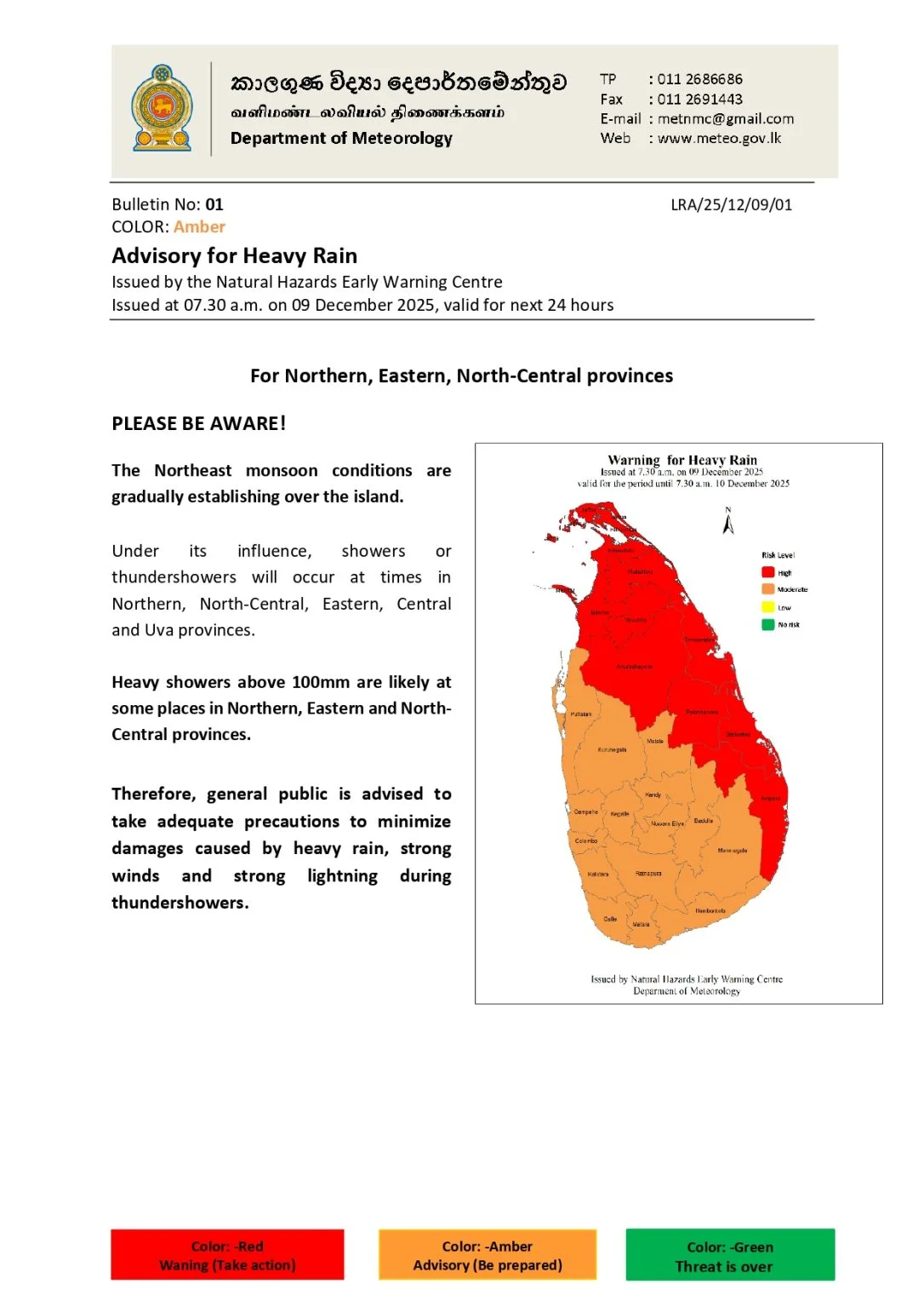 வடக்கு, கிழக்கு மற்றும் வடமத்திய மாகாணங்களில் சில இடங்களில் 100 மில்லி.மீற்றருக்கும் அதிகமான கனமழை பெய்யக்கூடும் என வானிலை ஆய்வு நிலையம் அறிவித்துள்ளது.