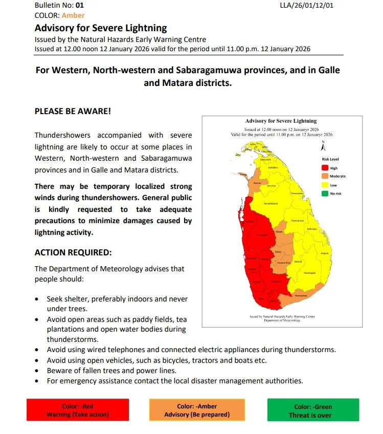 மேற்கு, வடமேற்கு மற்றும் சப்ரகமுவ மாகாணங்களிலும், காலி மற்றும் மாத்தறை மாவட்டங்களிலும் சில பகுதிகளில் இடியுடன் கூடிய மழை மற்றும் பலத்த மின்னல் பெய்யும் சாத்தியம் அதிகமாக இருப்பதாக அந்த அறிக்கையில் தெரிவிக்கப்பட்டுள்ளது.