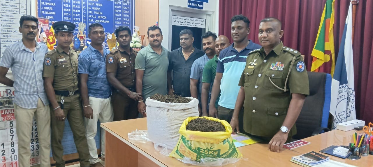 பருத்தித்துறை இன்பருட்டி கடற்கரை பகுதியில் கஞ்சா போதைப்பொருளுடன் இருவர் நடமாடுவதாக பொலிஸாருக்கு கிடைத்த இரகசிய தகவலின் அடிப்படையில் சம்பவ இடத்திற்கு விரைந்த பொலிஸார் இருவரையும் கைது செய்ததுடன், அவர்களிடம் இருந்து 28 கிலோ கஞ்சாவையும் மீட்டுள்ளனர்.