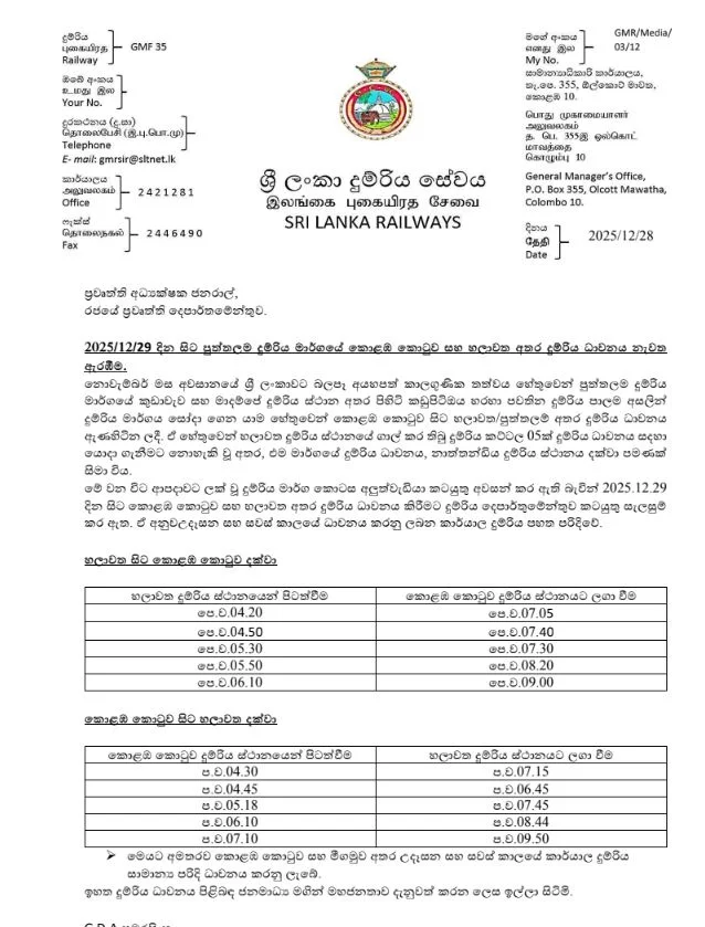 கொழும்பு கோட்டை மற்றும் சிலாபம் இடையே நாளை காலை மற்றும் மாலை வேளைகளில் இயக்கப்படவுள்ள அலுவலக ரயில்கள் பின்வருமாறு,