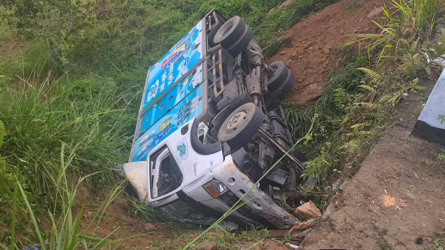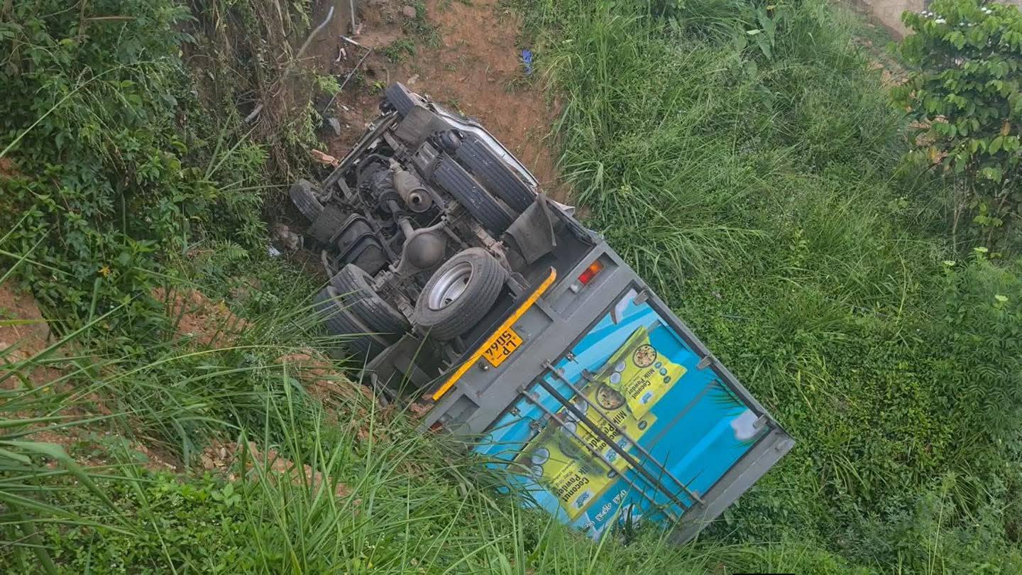 அதிக வேகத்தில் பயணித்த லொறி வீதியை விட்டு விலகி இவ்வாறு பள்ளத்தில் குடைசாய்ந்துள்ளது.