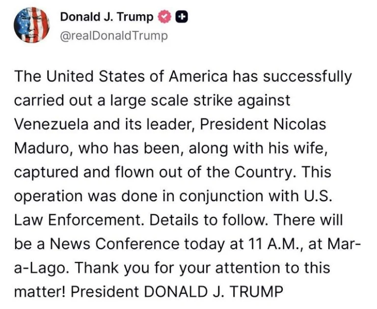 வெனிசுலா ஜனாதிபதி மதுரோவையும் அவரது மனைவியையும் அமெரிக்க இராணுவத்தினர் சிறைப்பிடித்துள்ளனர்.