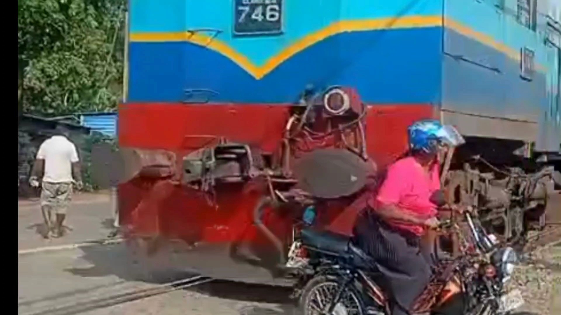 புகையிரதத்துடன் மோதுண்ட மோட்டார் சைக்கிள் - மயிரிழையில் உயிர் தப்பிய பெண்
