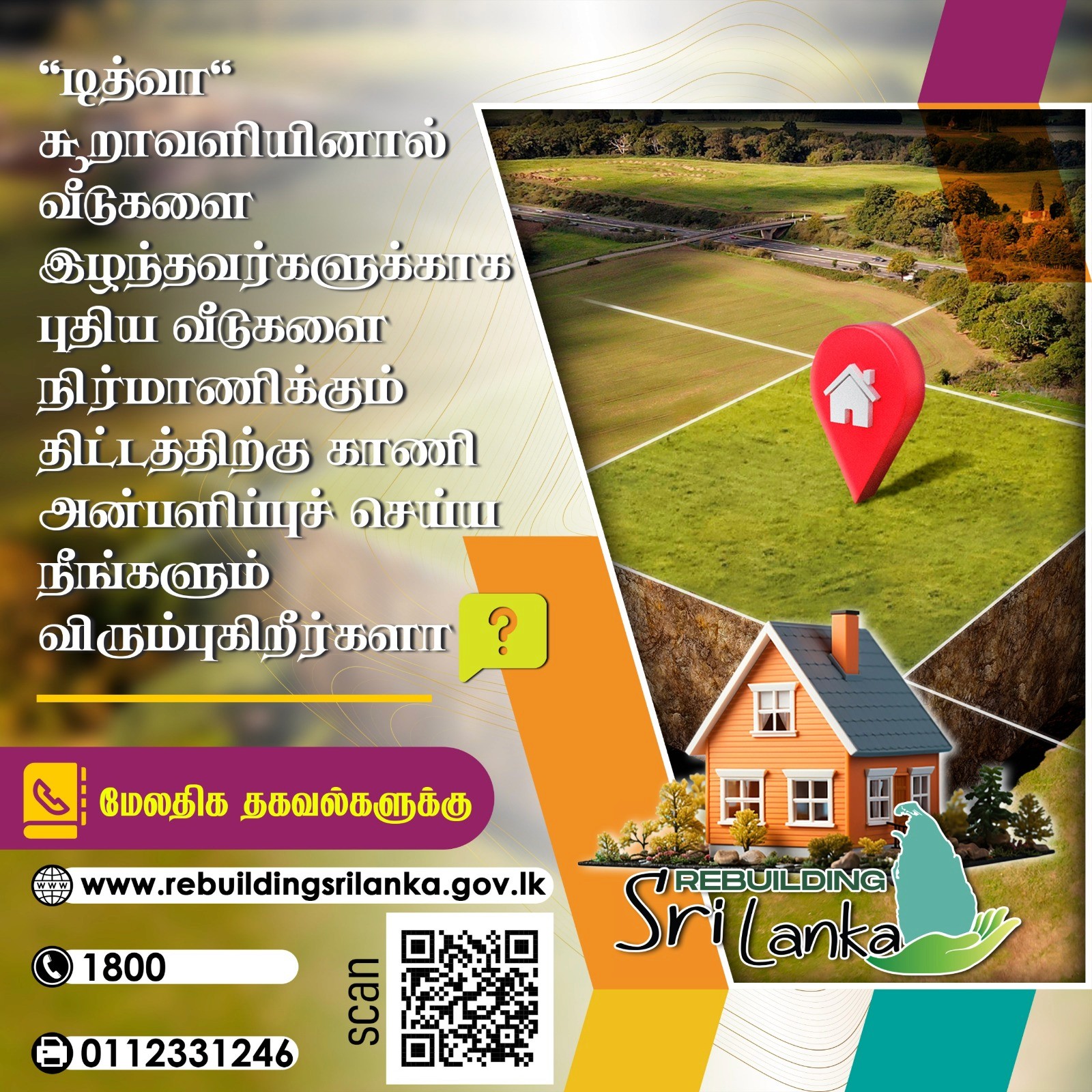 டித்வா சூறாவளியால் ஏற்பட்ட அனர்த்தம் காரணமாக ஏராளமான மக்கள் தமது வீடுகளையும் சொத்துக்களையும் இழந்துள்ளதால், பாதிக்கப்பட்ட மக்களை மீட்டெடுக்கவும் நாட்டை மீண்டும் கட்டியெழுப்பவும் அரசாங்கம் Rebuilding Sri Lanka வேலைத்திட்டத்தை ஆரம்பித்துள்ளது.