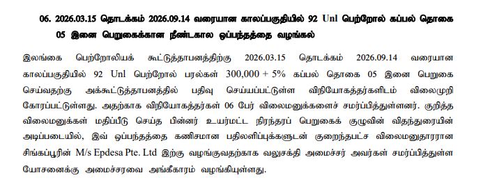சிங்கப்பூரின் M/s.EpdesaPte.Ltd.நிறுவனத்திற்கு 92 ரக பெற்றோல் அடங்கிய 05 கப்பல் தொகுதிகளைக் கொள்வனவு செய்வதற்கான நீண்டகால ஒப்பந்தத்தை வழங்குவதற்காக எரிசக்தி அமைச்சரினால் முன்வைக்கப்பட்ட யோசனைக்கு அமைச்சரவை அங்கீகாரம் வழங்கியுள்ளது.