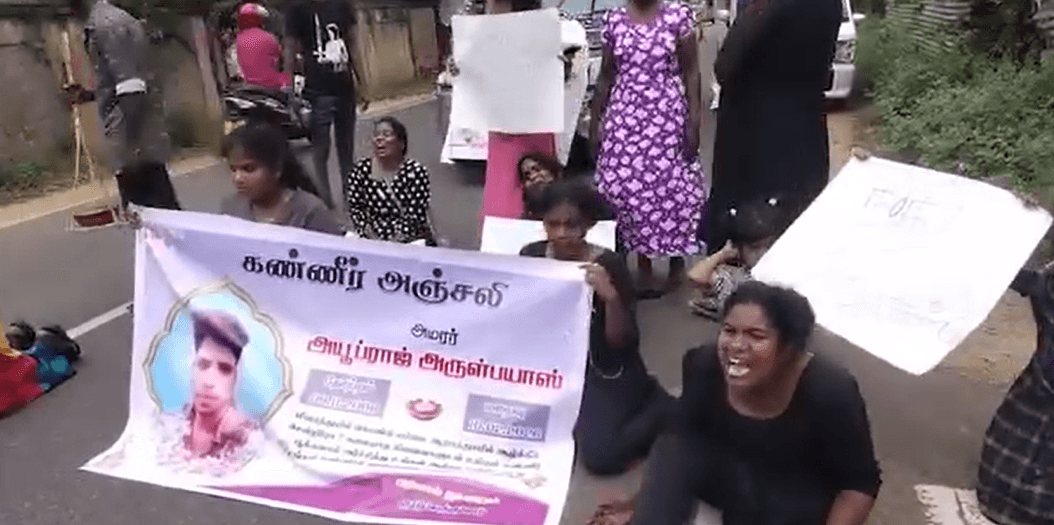 அதன்பின்னர் பதாகைகளை தாங்கியவாறு சடலத்துடன் வந்த உறவுகள் வீதியில் இருந்து “பொலிஸாரை கைது செய், எமது பிள்ளைக்கு நீதி வேண்டும், பொலிஸாரின் அராஜகம் தொடர்கிறது” என கோஷமிட்டவாறு போராட்டத்தில் ஈடுபட்டனர்.