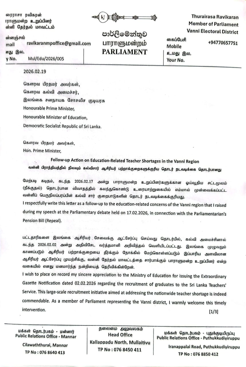மேற்படி கடிதம், கடந்த 2026.02.17 அன்று பாராளுமன்ற உறுப்பினர்களுக்கான ஓய்வூதிய சட்டமூலம் (நீக்குதல்) தொடர்பான விவாதத்தில் கலந்துகொண்டு உரையாற்றுகையில் எம்மால் முன்வைக்கப்பட்ட வன்னிப் பெருநிலப்பரப்பின் கல்வி சார் குறைபாடுகளின் தொடர் நடவடிக்கைக்குரியது.