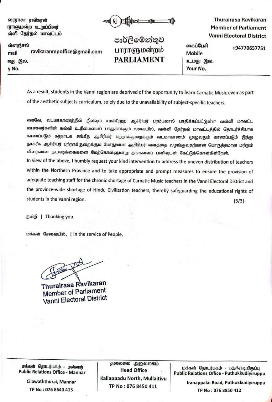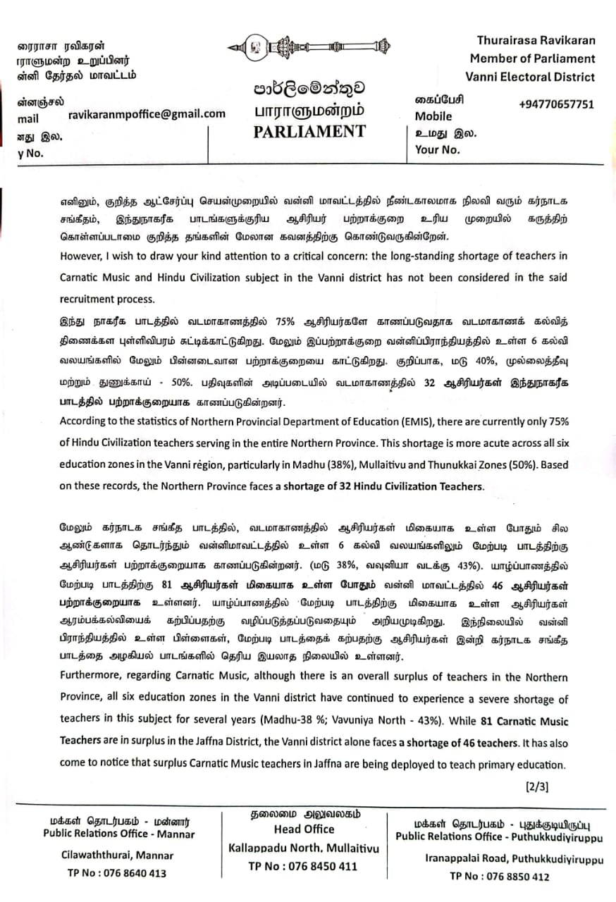 எனவே, வடமாகாணத்தில் நிலவும் சமச்சீரற்ற ஆசிரியர் பரம்பலால் பாதிக்கப்பட்டுள்ள வன்னி மாவட்ட மாணவர்களின் கல்வி உரிமையைப் பாதுகாக்கும் வகையில், வன்னி தேர்தல் மாவட்டத்தில் தொடர்ச்சியாக காணப்படும் கர்நாடக சங்கீத ஆசிரியர் பற்றாக்குறைக்கும் வடமாகாணம் முழுவதும் காணப்படும் இந்து நாகரீக ஆசிரியர் பற்றாக்குறைக்கும் போதுமான ஆசிரியர் வளத்தை வழங்குவதற்கான பொருத்தமான மற்றும் விரைவான நடவடிக்கைகளை மேற்கொள்ளுமாறு தங்களைப் பணிவுடன் கேட்டுக்கொள்கின்றேன் என அக்கடிதத்தில் குறிப்பிடப்பட்டுள்ளது.