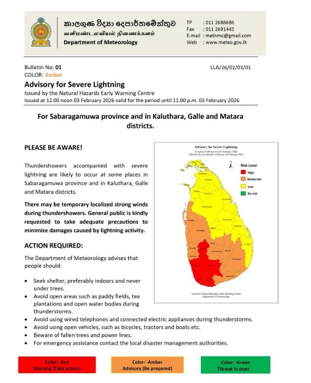 இடியுடன் கூடிய மழை பெய்யும் போது தற்காலிகமாக பலத்த காற்று வீசக்கூடும். மின்னல் தாக்கத்தால் ஏற்படும் சேதங்களைக் குறைக்க போதுமான முன்னெச்சரிக்கை நடவடிக்கைகளை எடுக்குமாறு பொதுமக்கள் கேட்டுக் கொள்ளப்படுகிறார்கள்.