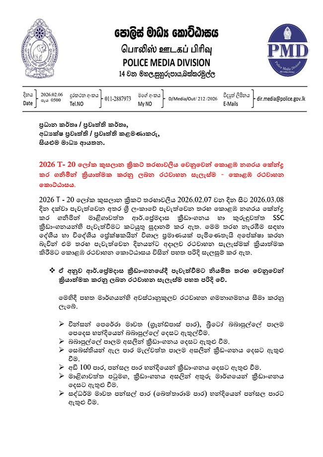 அதன்படி, நாளை முதல் மார்ச் 8 ஆம் திகதி வரை போட்டி நடைபெறும் காலப்பகுதியில், மாளிகாவத்தை ஆர். பிரேமதாச விளையாட்டரங்கம் மற்றும் கறுவாத்தோட்டம் SSC விளையாட்டரங்கம் ஆகியவற்றை அண்டிய பகுதிகளில் இந்தப் போக்குவரத்துத் திட்டம் அமுல்படுத்தப்படும்.