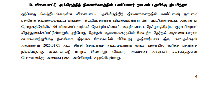 2026-01-01 முதல் நடைமுறைக்கு வரும் வகையில் திரு. அச்சுதனை அந்தப் பதவிக்கு நியமிக்க இளைஞர் விவகாரங்கள் மற்றும் விளையாட்டு அமைச்சர் சமர்ப்பித்த முன்மொழிவுக்கு அமைச்சரவை அனுமதி அளித்துள்ளது.