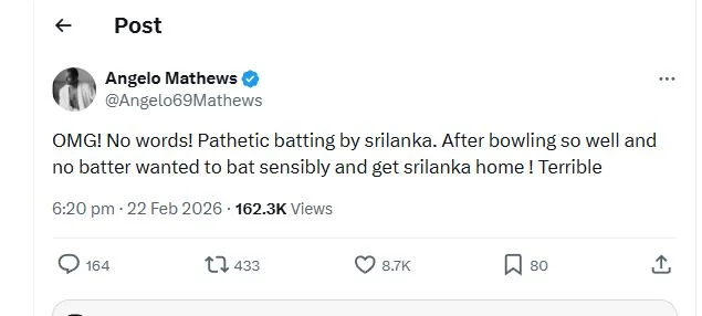 இலங்கை அணியின் தோல்வி குறித்து அவர் தனது ஆதங்கம் நிறைந்த கருத்தை எக்ஸ் தளத்தில் வெளியிட்டுள்ளார். பந்துவீச்சில் இலங்கை அணி சிறப்பான ஆட்டத்தை வெளிப்படுத்திய போதிலும் எந்தவொரு துடுப்பாட்ட வீரரும் நிதானத்துடனும், பொறுப்புடனும் விளையாடவில்லையென அவர் குறிப்பிட்டுள்ளார்.