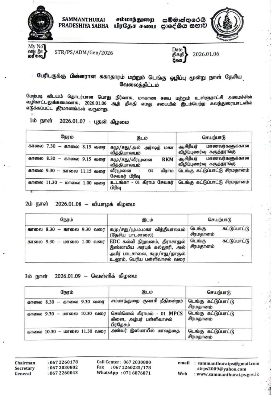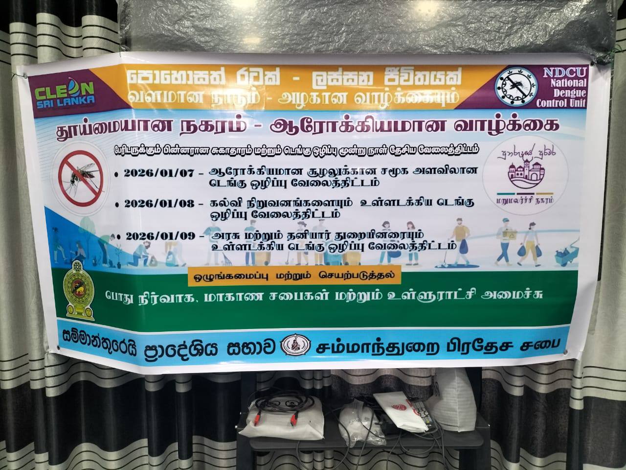 பொது நிருவாகம், மாகாண சபைகள் மற்றும் உள்ளுராட்சி அமைச்சின் ஊடாக, சுகாதார, கல்வி மற்றும் பாதுகாப்பு படை ஆகியவற்றுடன் உள்ளுராட்சி நிறுவனங்களின் பங்களிப்புடன் அரச துறை, தனியார் துறை மற்றும் பொது மக்களுடன் இணைந்து, 2026 ஜனவரி 07 முதல் 09 வரை நாடளாவிய ரீதியில் டெங்கு ஒழிப்புக்கான மூன்று நாள் தேசிய வேலைத்திட்டம் முன்னெடுக்கப்படவுள்ளது.