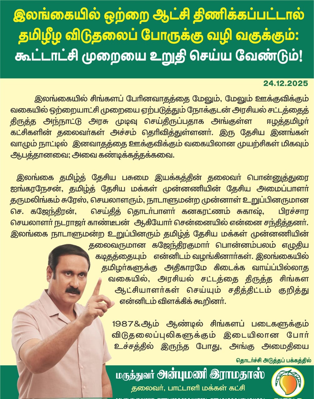 எனவே, தமிழர்களுக்கு அர்த்தமுள்ள சுயாட்சியுடன் கூடிய கூட்டாட்சி அமைப்பு உறுதி செய்யப்பட வேண்டும் என்றும் பாட்டாளி மக்கள் கட்சியின் தலைவர் அன்புமணி ராமதாஸ் வலியுறுத்தியுள்ளார்.