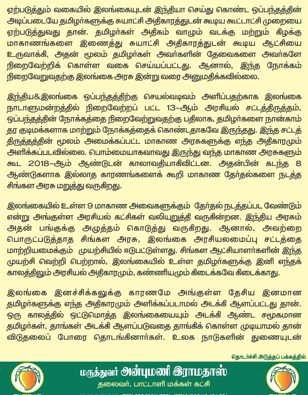 1987ஆம் ஆண்டு இந்திய - இலங்கை ஒப்பந்தத்தை நினைவு கூர்ந்துள்ள அன்புமணி, இந்த ஒப்பந்தம் வடக்கு மற்றும் கிழக்கு மாகாணங்களை இணைப்பதன் மூலம் தமிழர்களுக்கு சுயாட்சியுடன் கூடிய கூட்டாட்சி அமைப்பைக் கருத்தில் கொண்டது என்பதைச் சுட்டிக்காட்டியுள்ளார்.