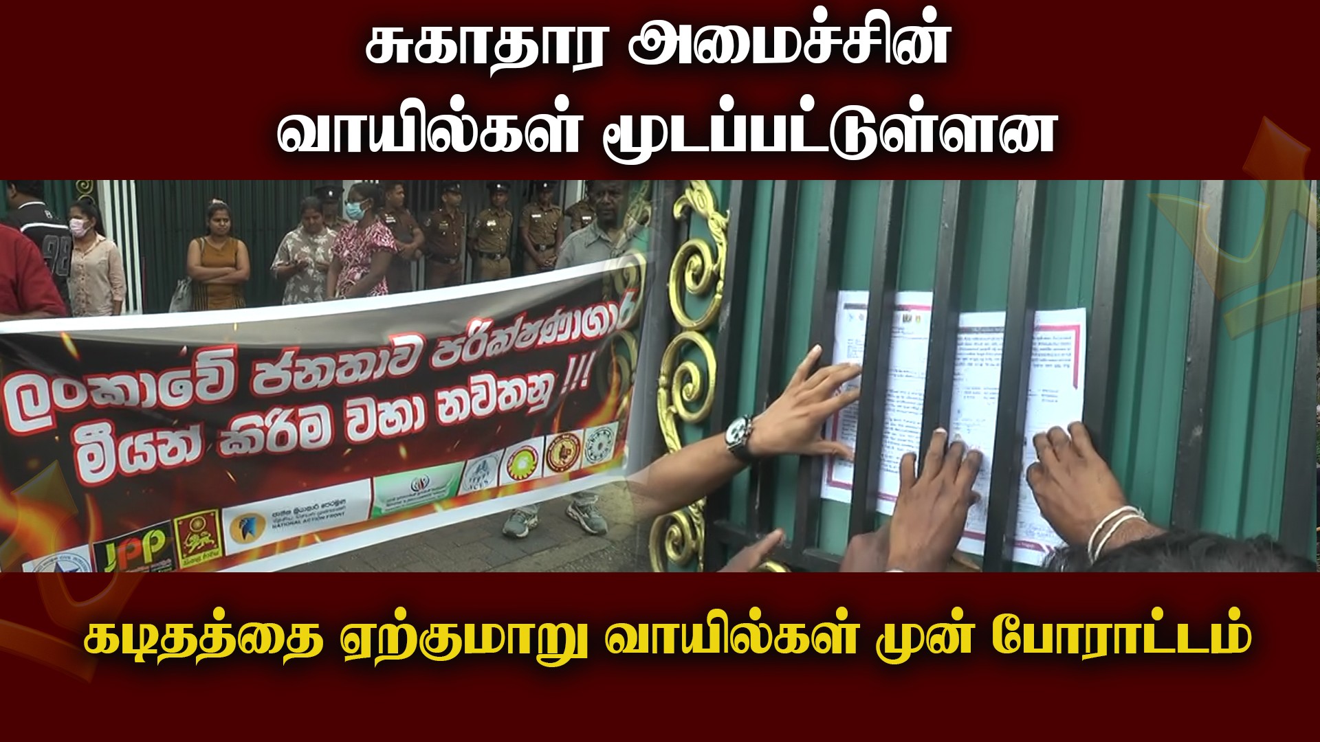 சுகாதார அமைச்சின் வாயில்கள் மூடப்பட்டுள்ளன : கடிதத்தை ஏற்குமாறு போராட்டம்